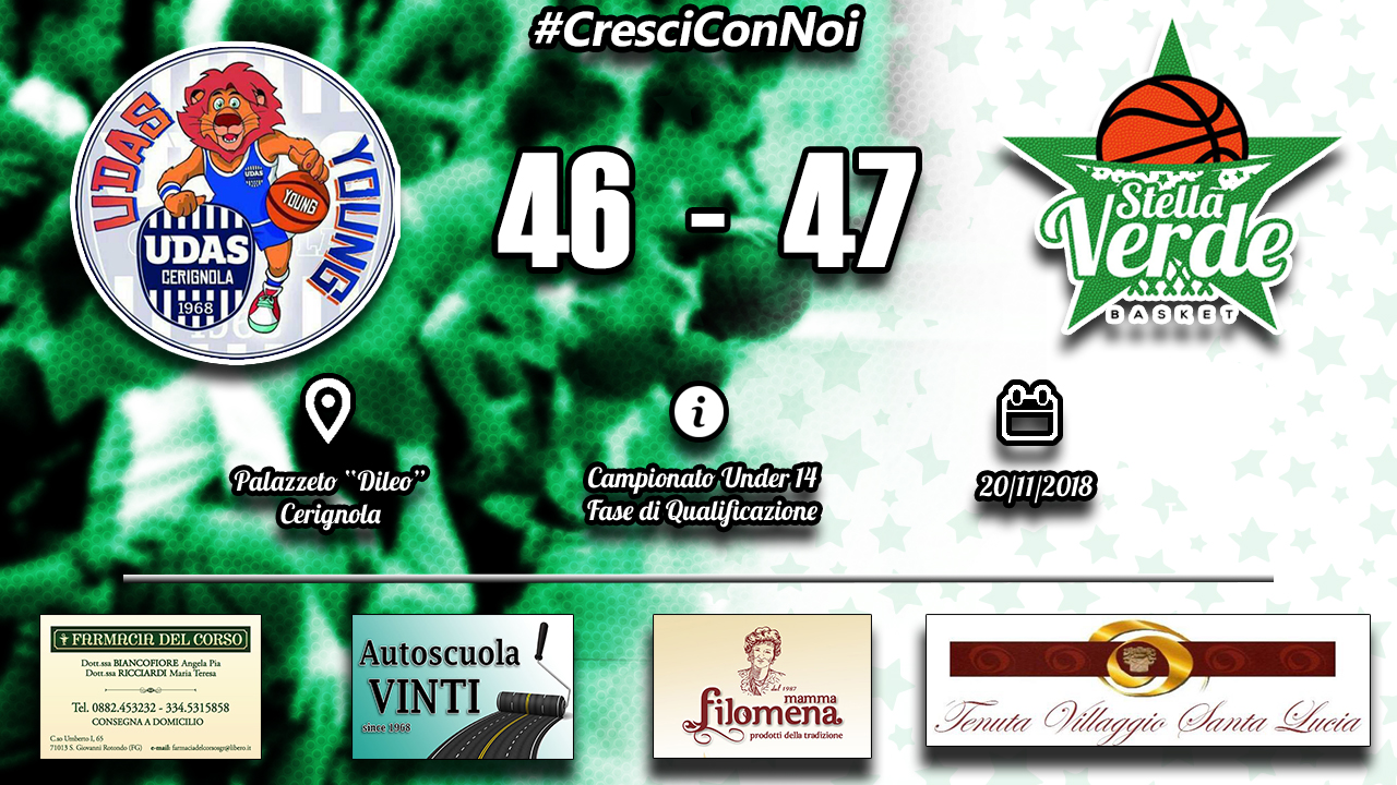 Partita equilibrata dalla prima frazione dove ha visto i cerignolani comunque sempre in vantaggio. 10 a 9 il risultato per i padroni di casa alla fine del primo periodo, 23 a 22 all’intervallo lungo e situazione di parità sul 37 pari a fine terzo quarto. Al quarto quarto arriva la piccola, ma fatale, zampata vincente da parte dei “verdi” che, reduci dall’ottima prestazione di sabato scorso contro il Manfredonia, riescono a trovare il vantaggio definitivo a 2 secondi dalla fine con un glaciale Palladino al tiro libero. 47 a 46 in favore della Stella Verde Basket e primo referto rosa portato a casa.